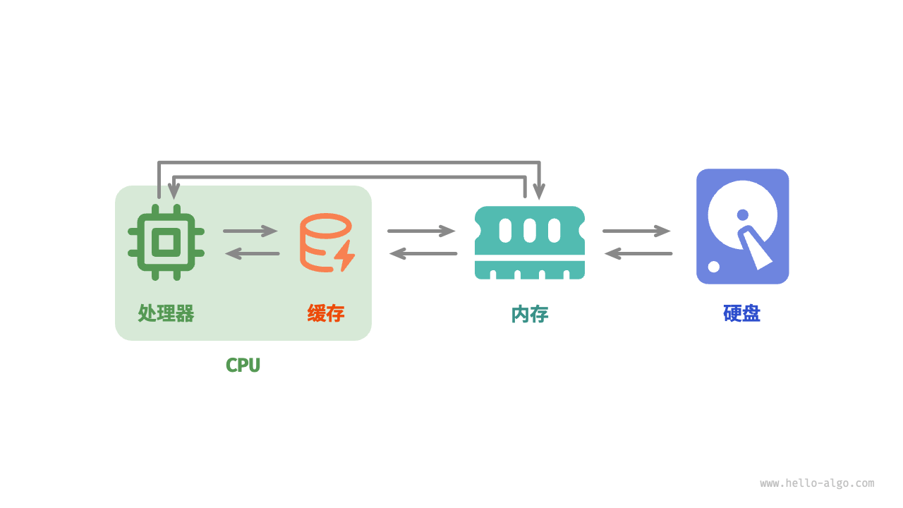 如下图所示,在程序运行时,数据会从硬盘中被读取到内存中,供 CPU 计算使用。缓存可以看作 CPU 的一部分,它通过智能地从内存加载数据,给 CPU 提供高速的数据读取,从而显著提升程序的执行效率,减少对较慢的内存的依赖。
