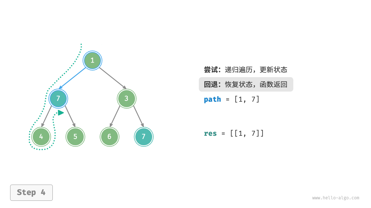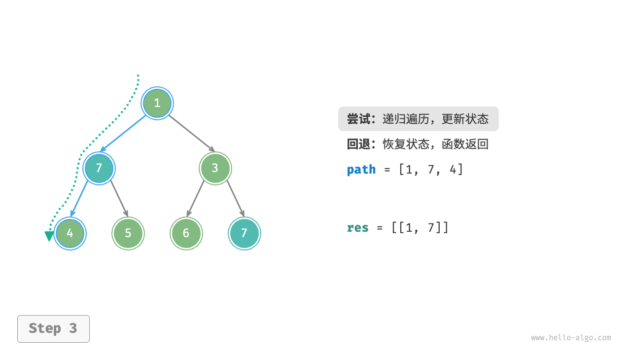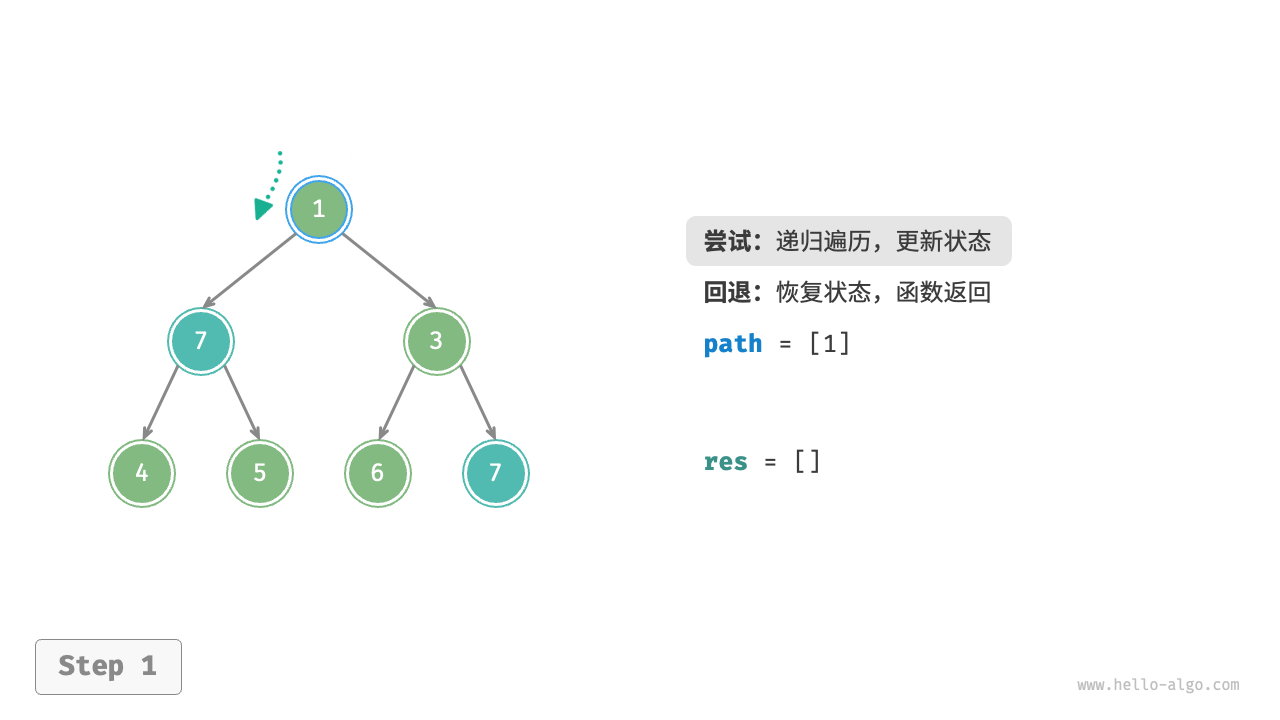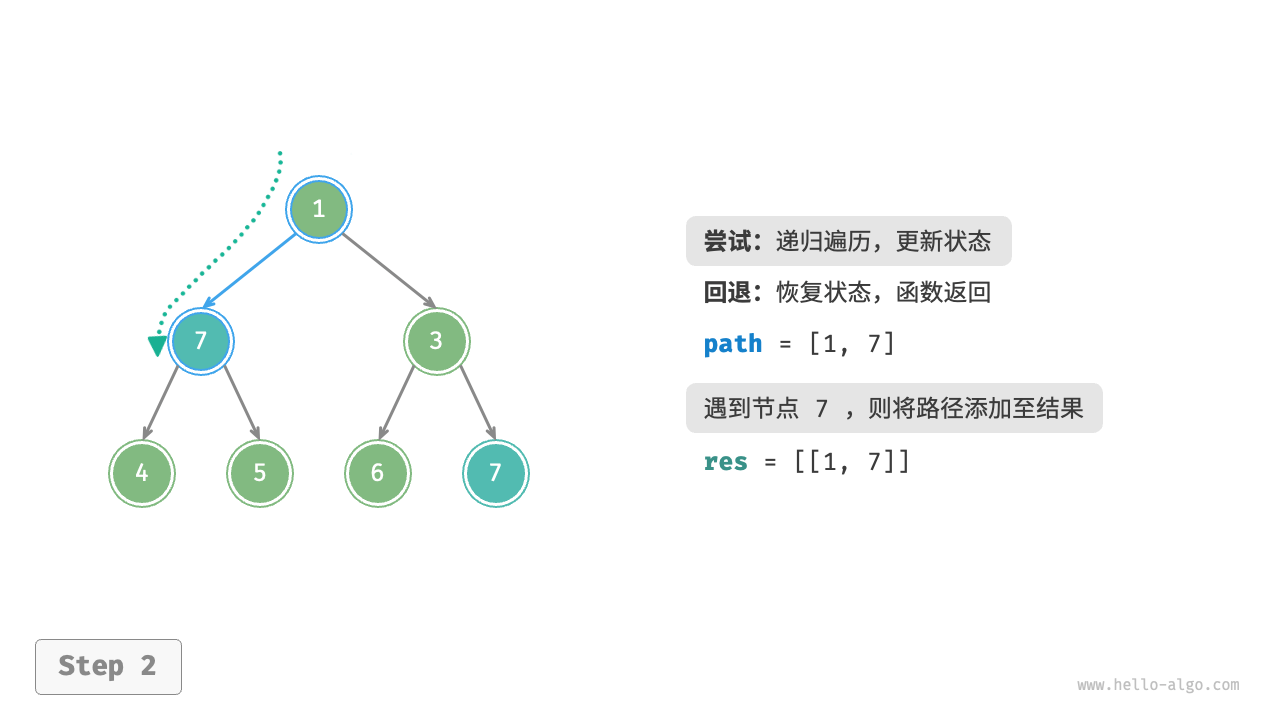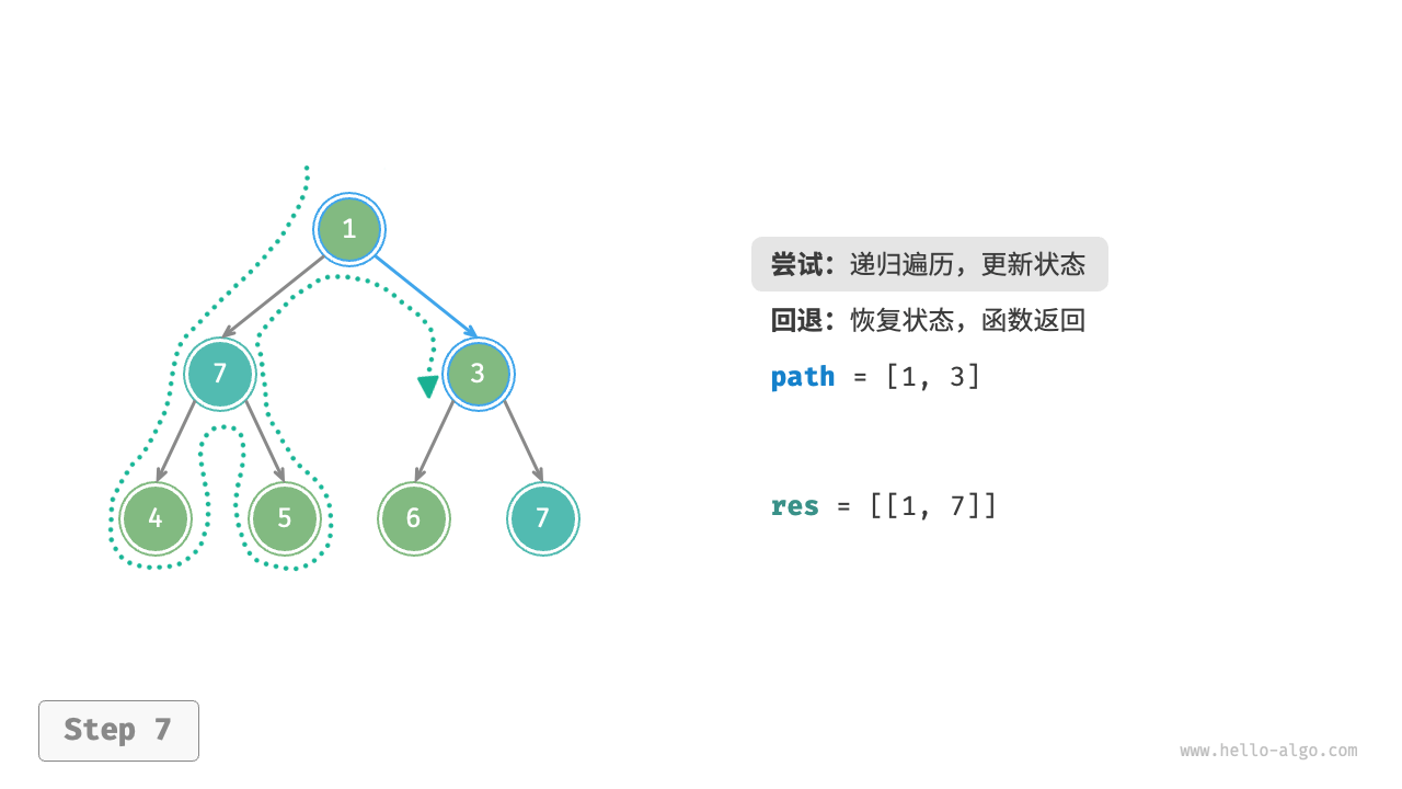 | 尝试(attempt) | 尝试是根据可用选择来探索解空间的过程,包括做出选择,更新状态,检查是否为解 | 递归访问左(右)子节点,将节点添加进 path ,判断节点的值是否为 \(7\) |