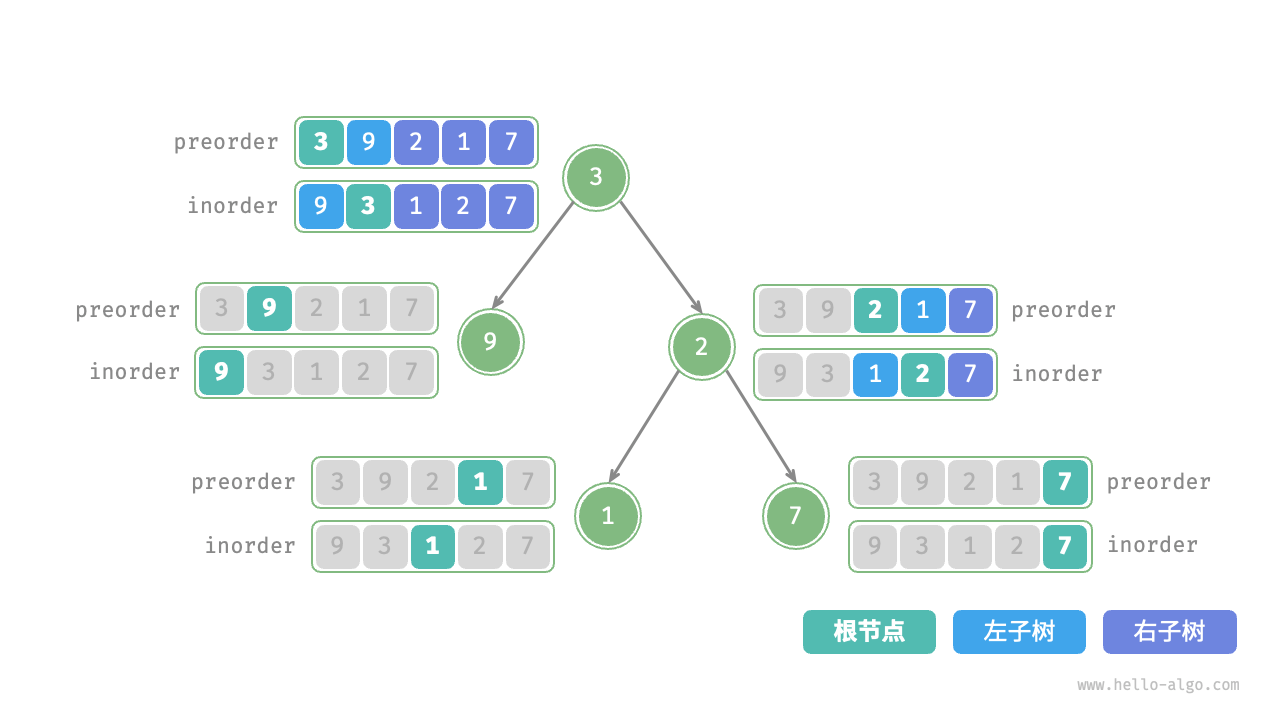 inorder的划分结果,易得左子树和右子树的节点数量分别为 1 和 3 ,从而可将preorder划分为[ 3 | 9 | 2 1 7 ]。