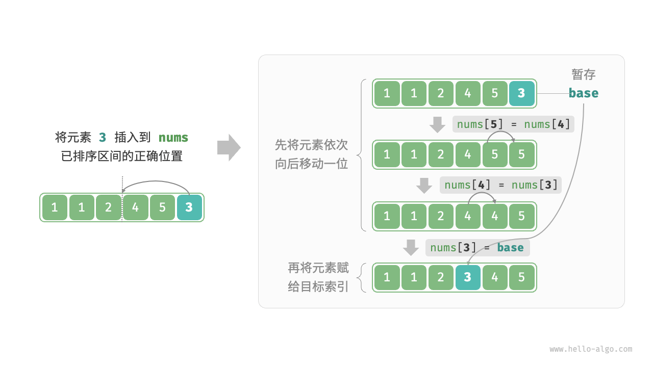 下图展示了数组插入元素的操作流程。设基准元素为 base ,我们需要将从目标索引到 base 之间的所有元素向右移动一位,然后将 base 赋值给目标索引。