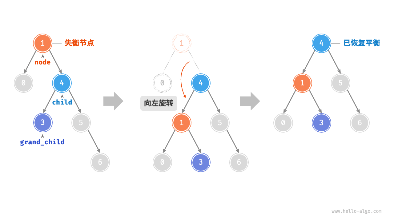 AVL 树的特点在于“旋转”操作,它能够在不影响二叉树的中序遍历序列的前提下,使失衡节点重新恢复平衡。换句话说,旋转操作既能保持“二叉搜索树”的性质,也能使树重新变为“平衡二叉树”。